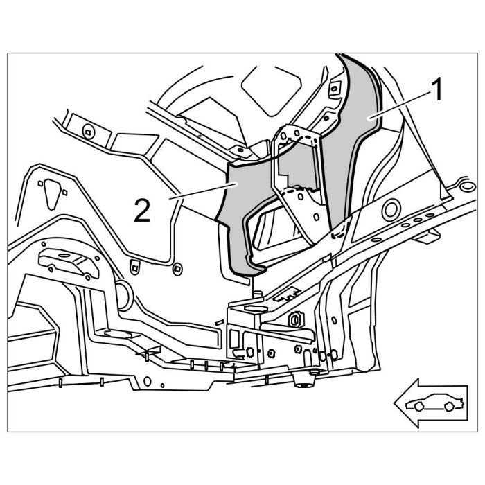 1. Pull off protective film and stick sound absorber for left side of engine compartment -1- on the body.