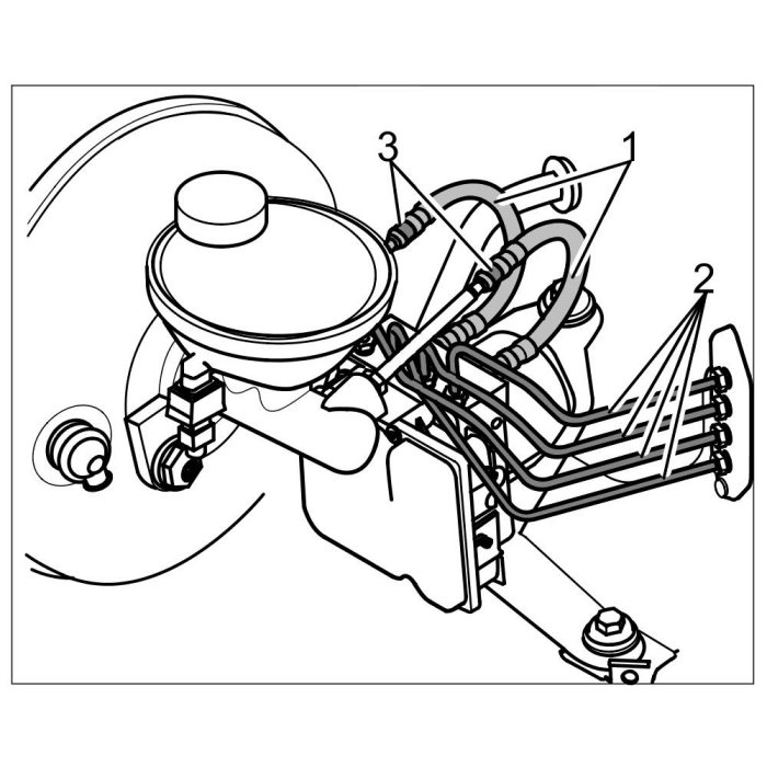 When tightening the brake lines -1- on the brake master cylinder (25 Nm/19 ftlb.), use special tool retaining device 9763 to counter at the crimping point of the hose (close to the rigid line) -3-. This prevents the hoses from twisting away from the new type of brake lines -1- that are used (modified material at the cap screws/legal requirement).