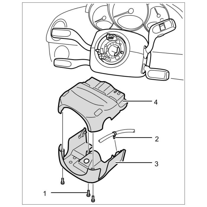 Unclip upper steering-column panel -4- , see -arrows- , and disconnect electric plug connection.