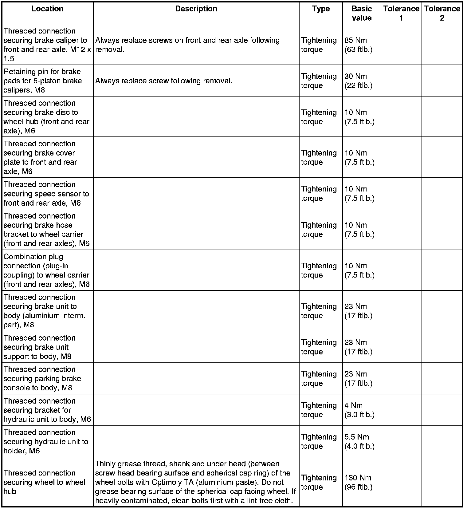 Tightening torques for mechanical brake