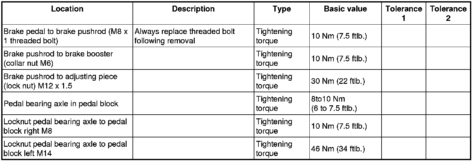 Tightening torques for brake pedal/pedal bearing axle