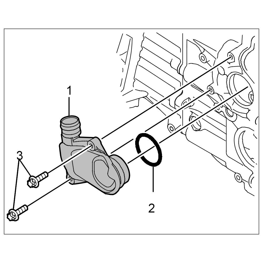 29.1. Unscrew three external Torx screws (E10, M6 x 25) -1- on the connecting tube for the coolant regulator housing.