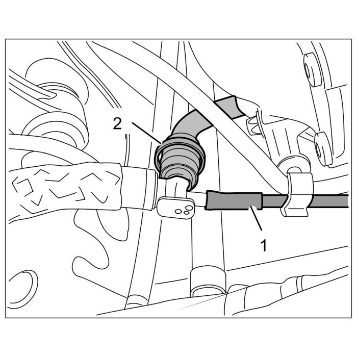14. Pull off connecting hose -2- to the oil filler neck by opening the spring band clamp -1- and pulling off the hose.