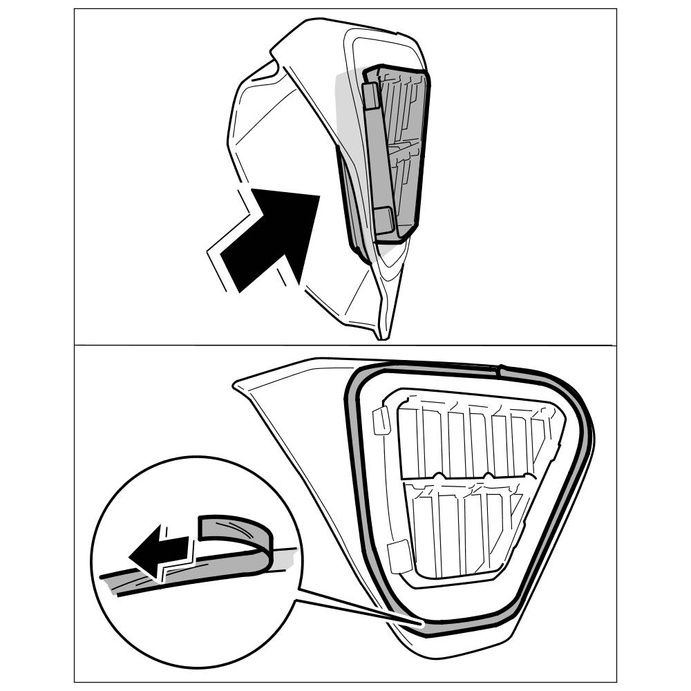 2. Position the ventilation cover together with the air box on the body and clip in the ventilation cover. Press on the air box in the sealing area to the body again.