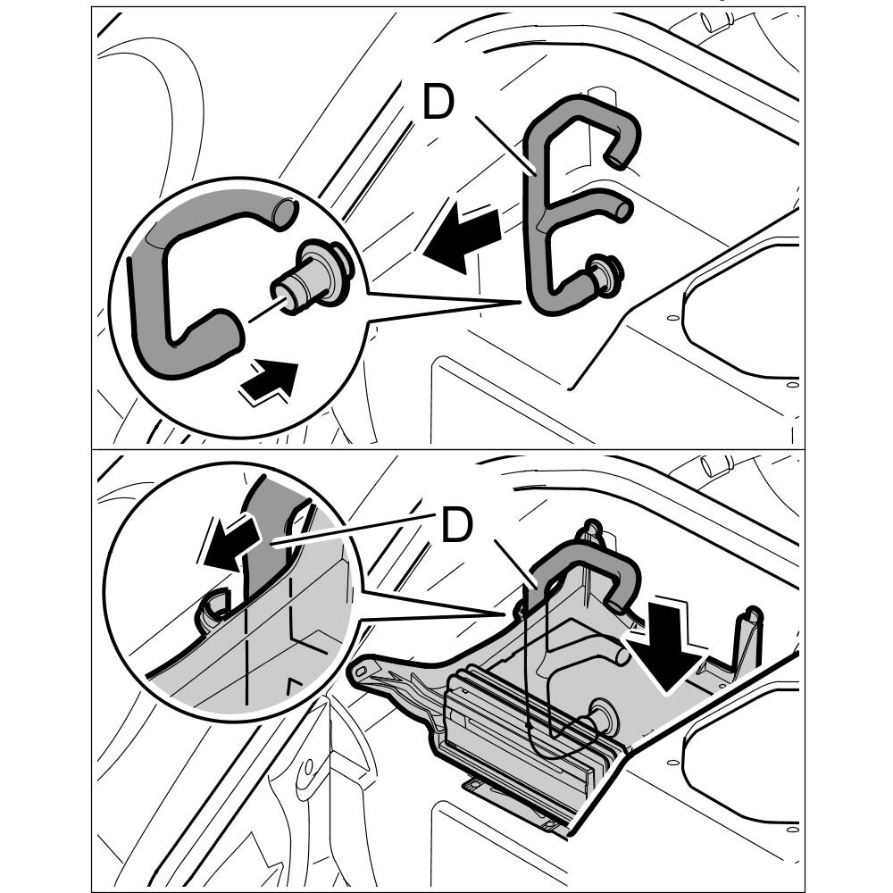 4. Route booster air guide -D- around the body and insert into the upper air guide.