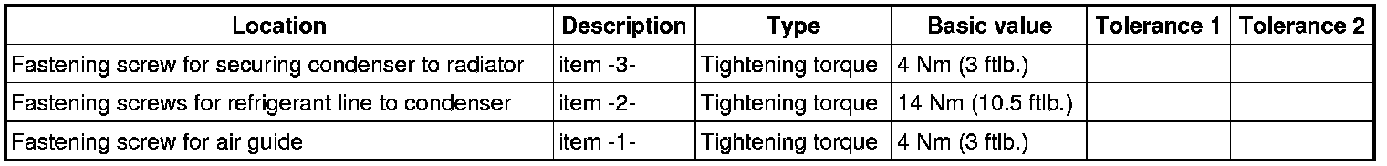 2. Engage the condenser on the radiator bracket and secure with the fastening screw -3-. => Tightening torque: 4 Nm (3 ftlb.)