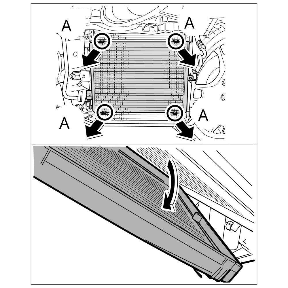 2. Pull the air guide forward and disengage it at the condenser -A-.