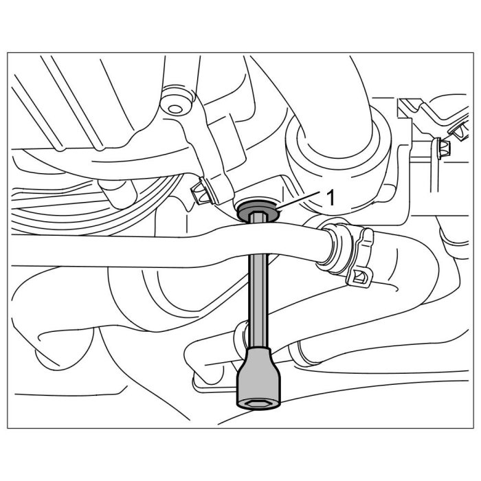 3. Unscrew the coolant drain plug (internal Torx, a/f 8) M14 x 1.5 -1- at the coolant regulator housing.