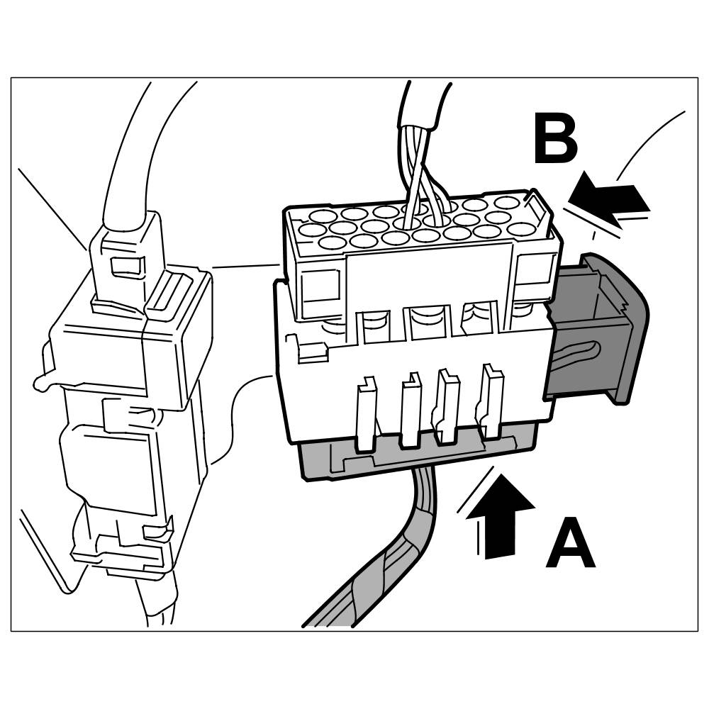 34.2. Push together plug connection between front-end wire harness and main wire-harness right -Arrow A- and lock -Arrow B-.