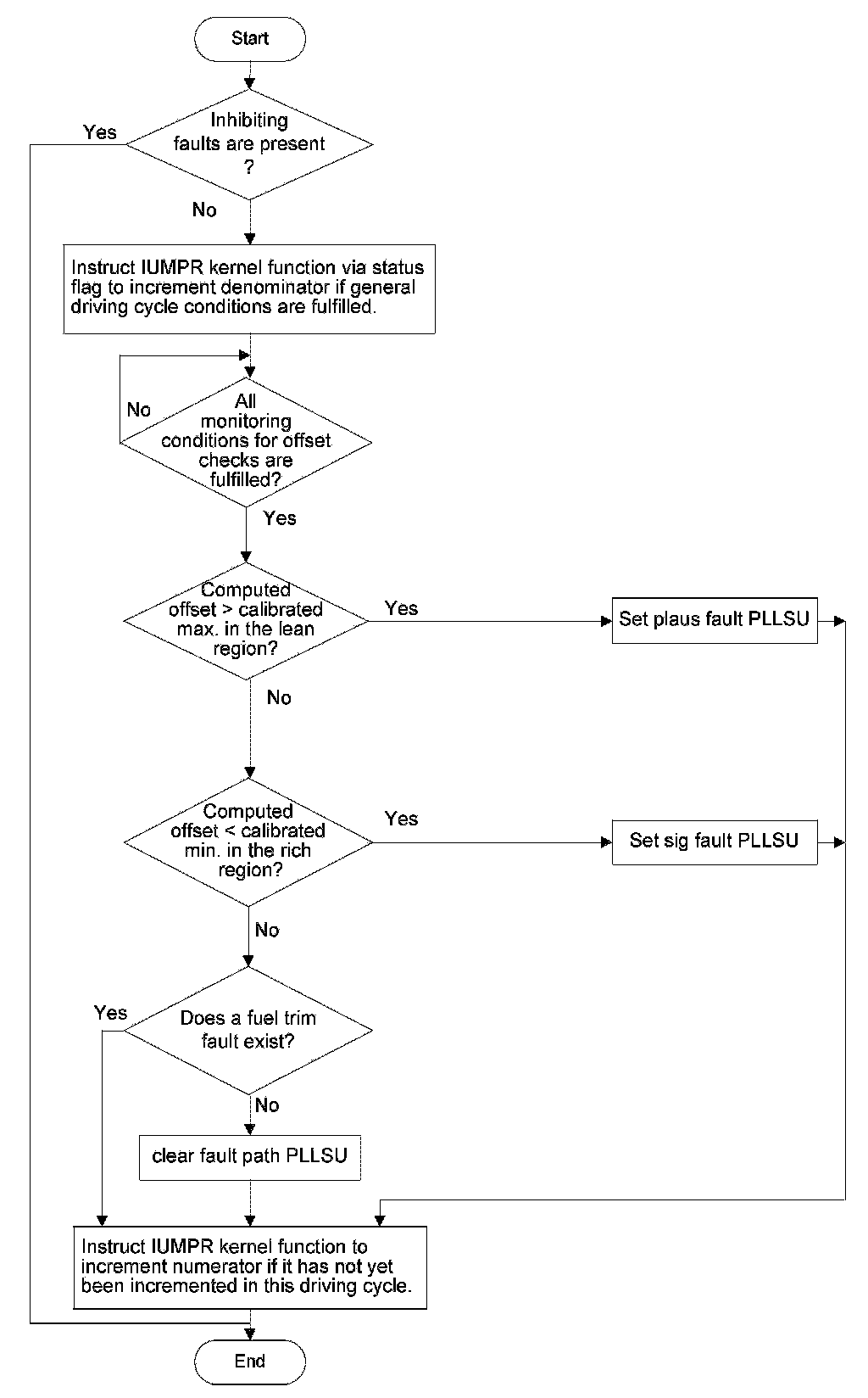The denominator is incremented if the standardized conditions are met within the actual driving cycle and the monitor is not inhibited due to previously stored faults or faults detected on the sensors necessary to determine the denominator itself.