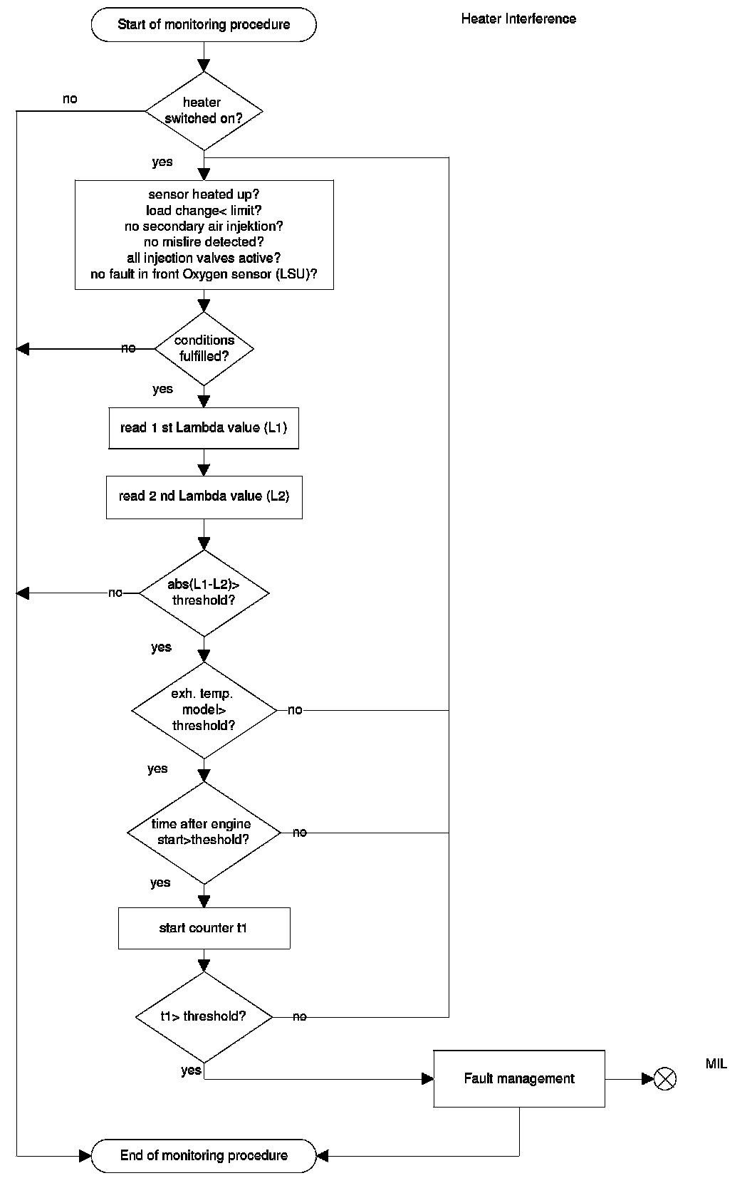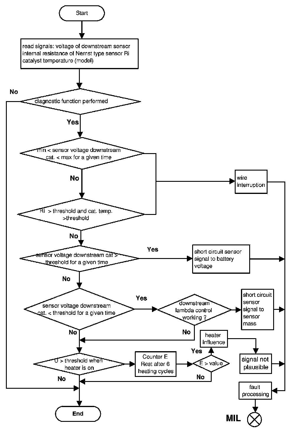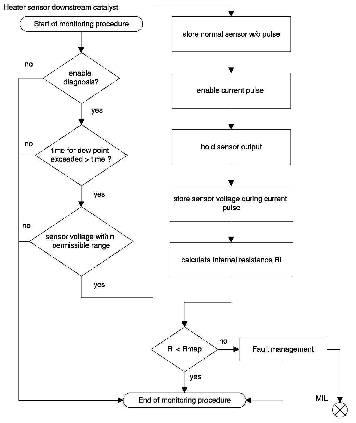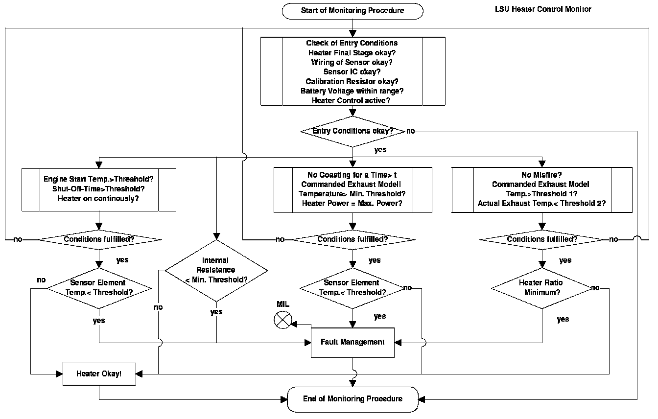 For diagnostic of the sensor heater a specific current pulse is supplied via a load resistance and the voltage is measured. The intern resistance of the sensor heater is calculated with the voltage deviation. The result will be compared with a reference map resistance, which considers aging and sampling deviations. In case of internal resistance > map resistance the diagnosis stores a fault and the MIL will be illuminated.