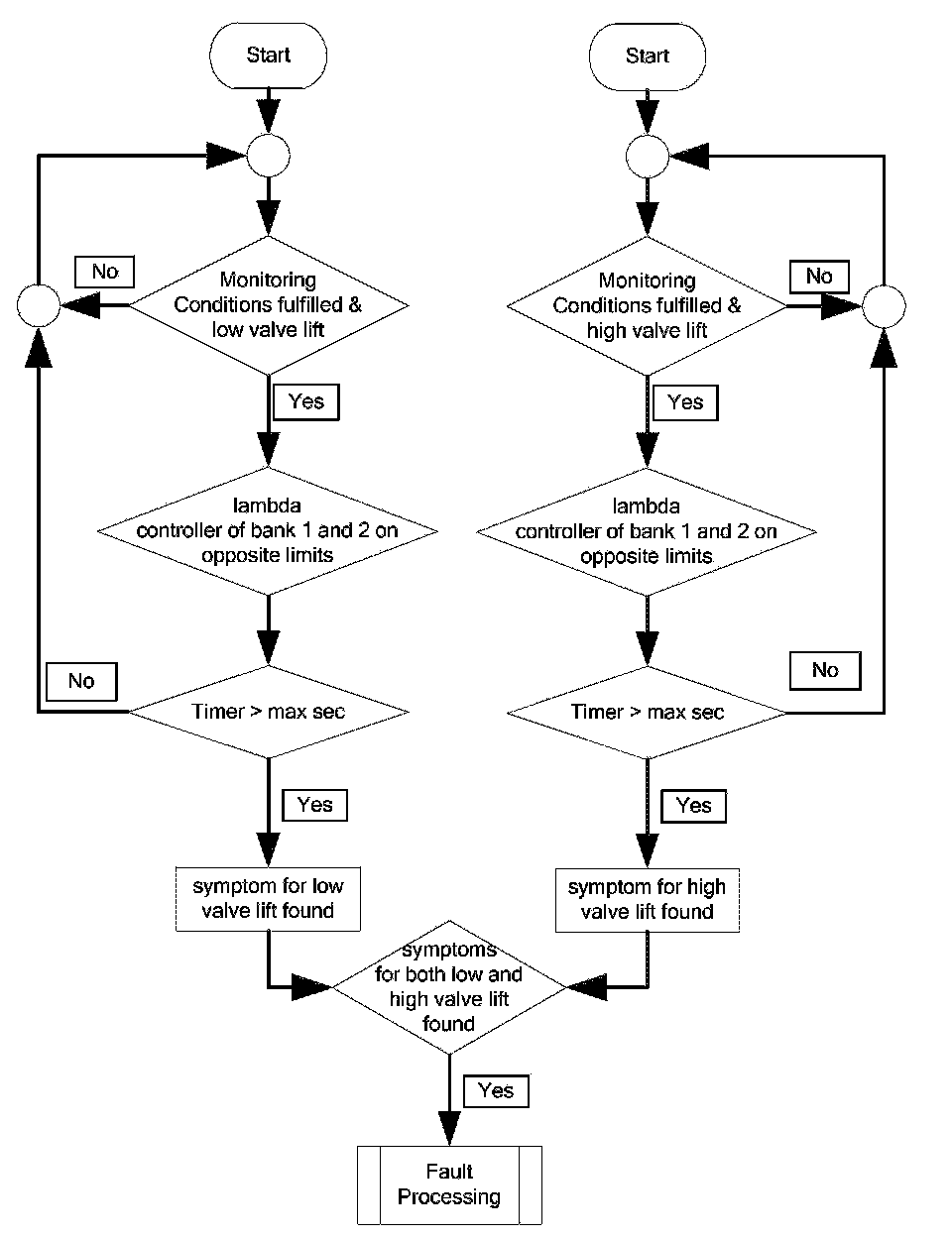 If the Lambda control output exceeds the threshold in the direction R2L or stucks at a limit for the required amount of time, the threshold or the limit must achieve the opposite direction (L2R) for the required amount of time. Then an error counter is incremented. The thresholds are expected to always be reciprocally exceeded, which means that if the rich threshold is exceeded, then the lean threshold must be exceeded. Otherwise the rich counter will not be further incremented.