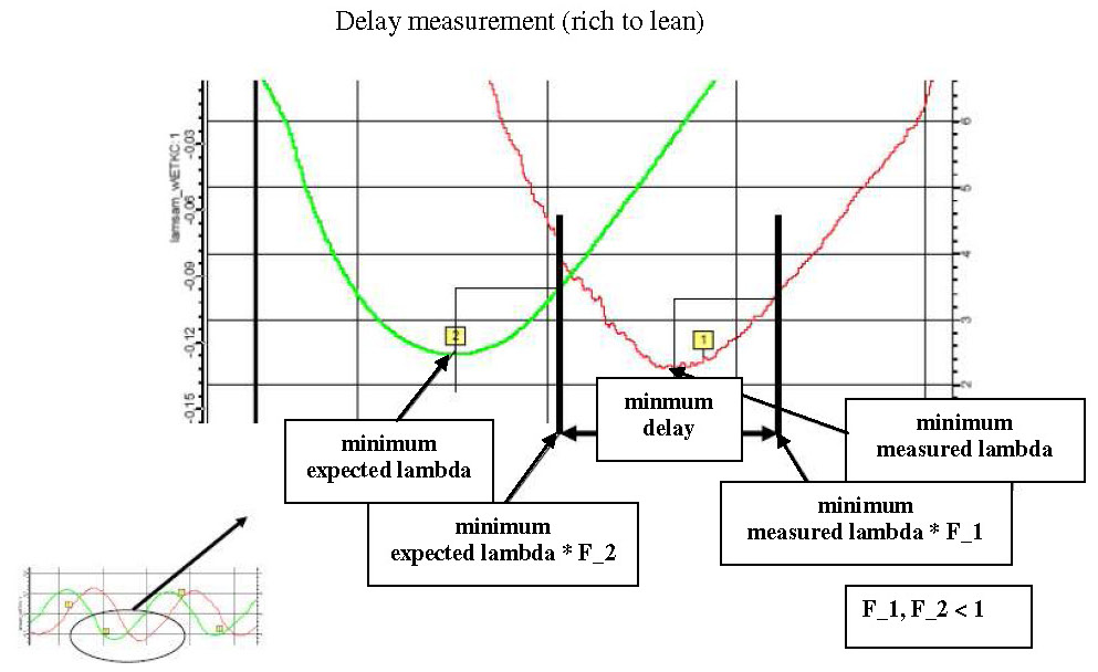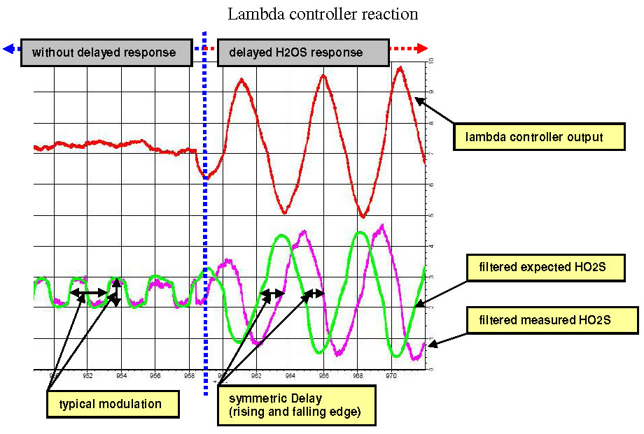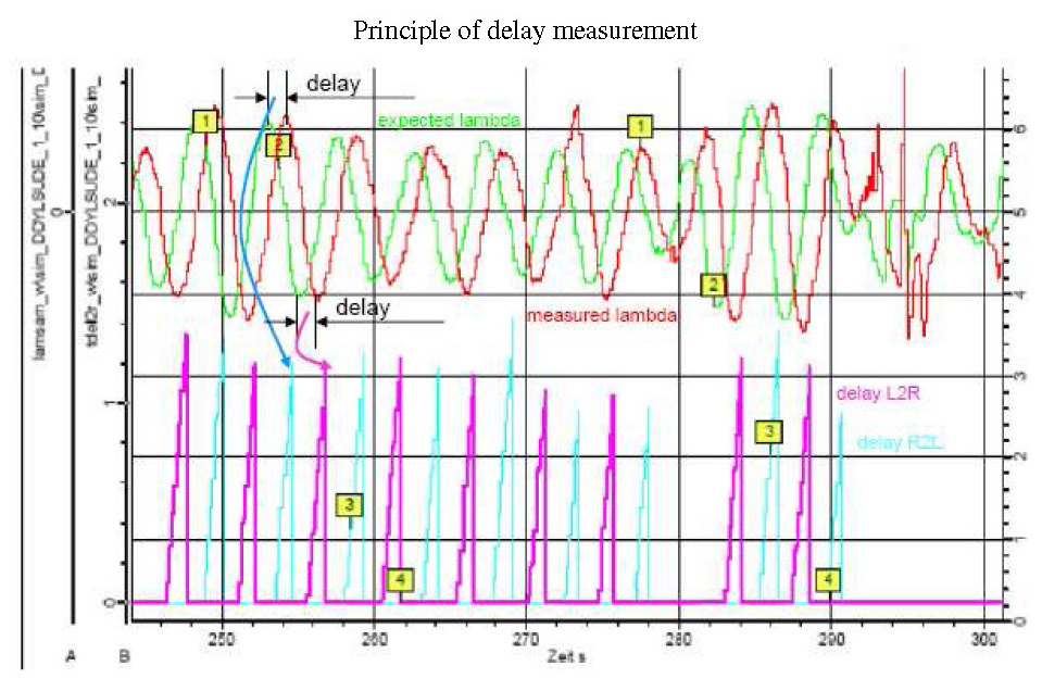 - At the moment that the measured lambda signal would have a maxima / minima, a disturbance occurs according to lean / rich, which allows the lambda signal to further rise / fall and thus moves the maxima / minima back. The measured time delay is then too great.