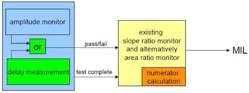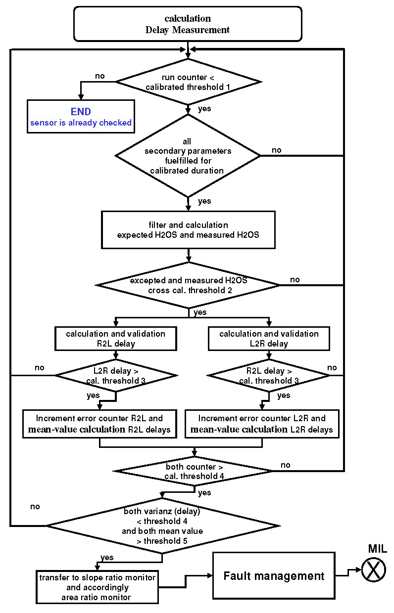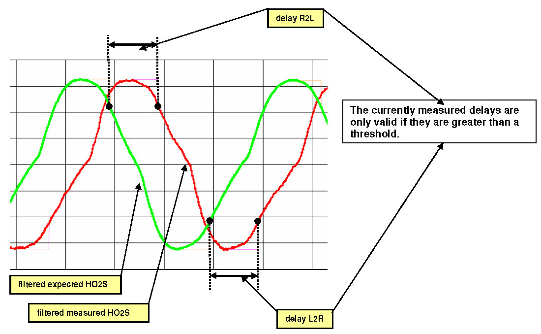 Pure delay is not known as a fault mode of a wideband O2S, but the detection of a pure delay is required by regulation. A delayed response could affect the catalyst diagnostic and lead to higher emissions. Therefore this additional function monitors the HO2S Response. The monitor is performed once per driving cycle as long as the enable conditions are met and consists of two parts of monitors. The Amplitude Monitor and the Delay Measurement monitoring function. These partial functions of the Response Rate Monitor are designed strictly for symmetrical delay recognition (both slopes R2L and L2R are influenced).