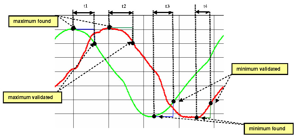 - Time period (figure 5: t1..t4) between recognised maximum or minimum values and their confirmations is within a calibrated range (typical range: ~0.02-2s)