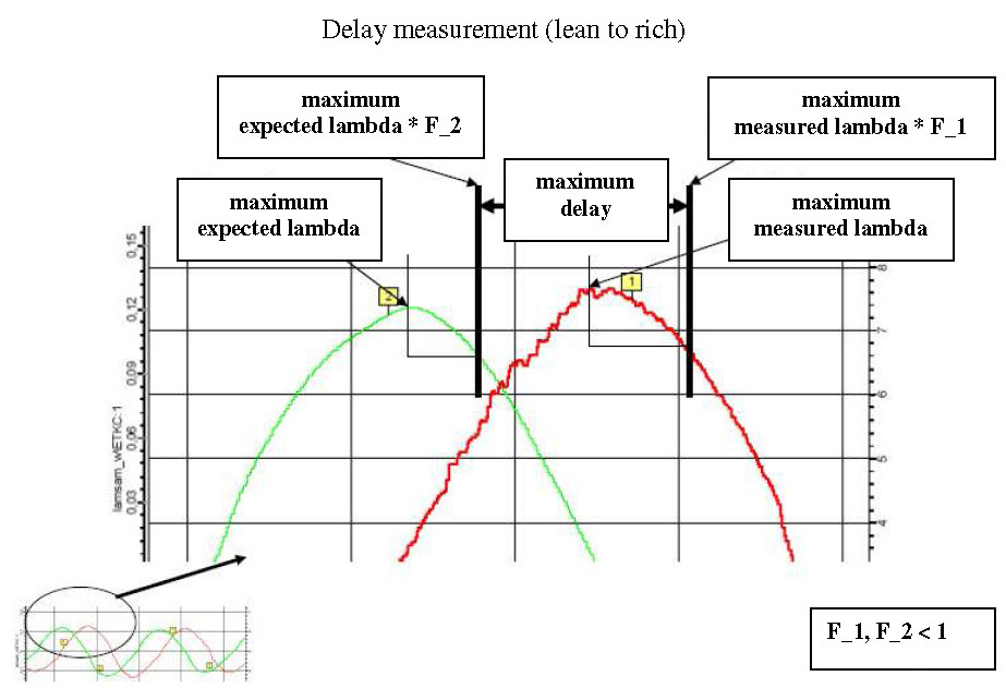 An exact measurement of the delay time is not always possible, it is recommended to first evaluate it from an applicable minimum amplitude (typical value: ~0.03-0.08) of the filtered measured and expected signal. If the threshold value is exceeded, a time measurement begins and the corresponding maxima (rich) or minima (lean) is determined for the expected and measured signal. The time measurement is triggered after the maxima or minima of the expected and measured signal is reliably recognised. A minimal signal change in the opposite direction is required (secure recognition of the turning points in the signal courses).