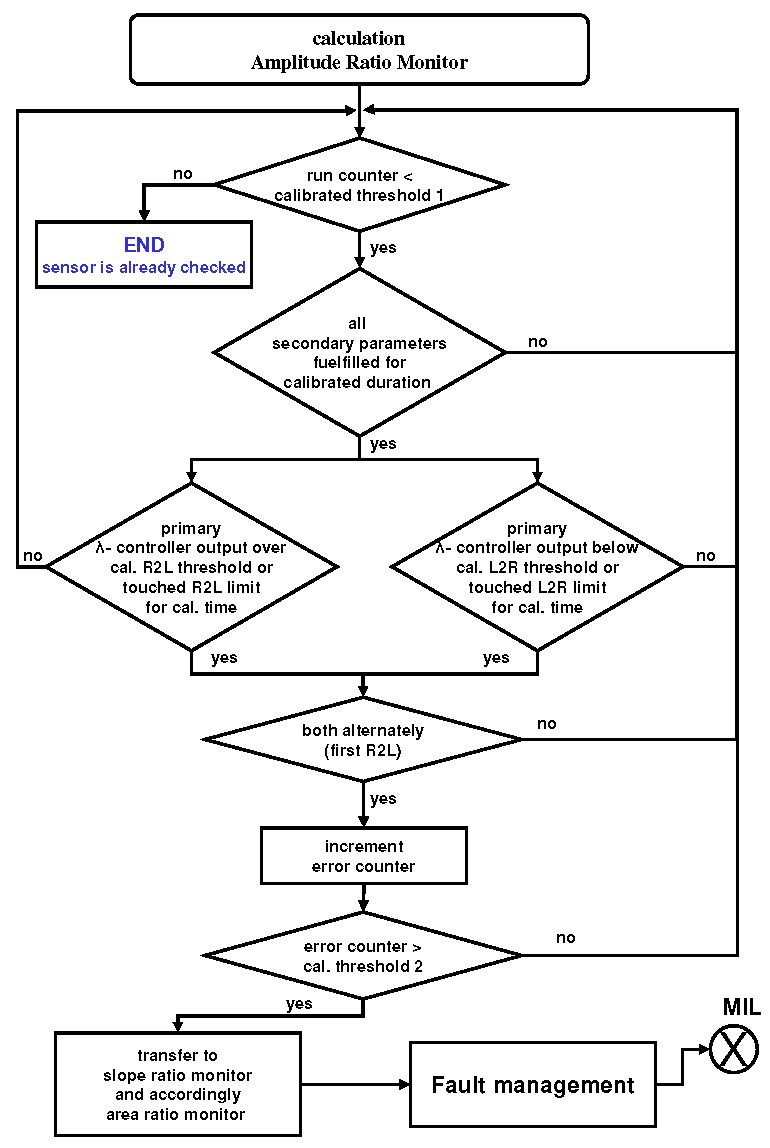If the enable conditions are met, the measured value of the amplitude monitor is valid. In order to avoid misdetection from, for example, disturbance by load alternation, the thresholds must be calibrated at a relatively high values (typical value: lean~ 1.18; rich~ 0.82). For this reason a robust fault detection below a minimal control deviation is not possible. Furthermore, the time, which stuck the control factor at its limits or over the calibrated thresholds, must be greater than a calibrated time threshold (typical value: ~ 0.1-0.5 s).