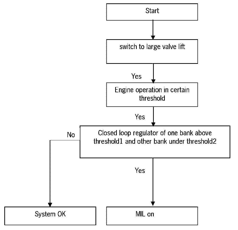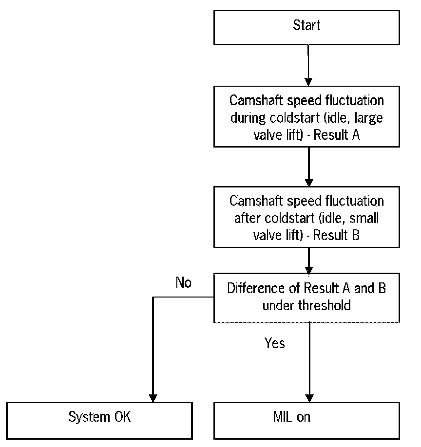 The monitor runs after coldstart with large valve lift during engine idle and vehicle speed at zero. A second phase of engine idle and vehicle speed at zero is needed after coldstart. In both phases the position of the camshaft has to be static.