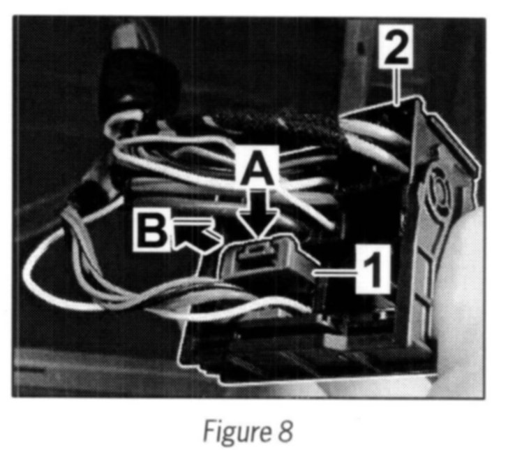 2.6.2 Press locking mechanism down --> Figure 8 -arrow A- and pull standard connector module C (coding: blue) --> Figure 8 -1- out of the PCM central connector --> Figure 8 -2- (--> Figure 8 -arrow B-).