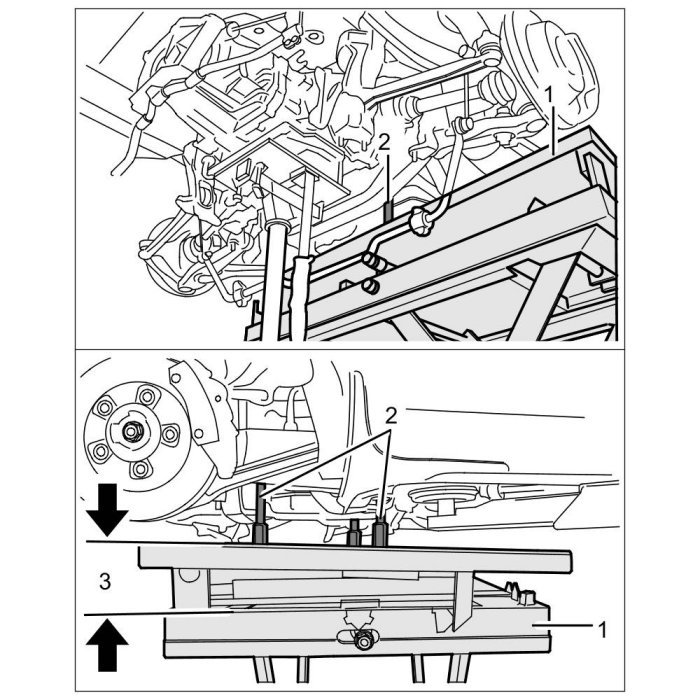 6.2. Position unit lifting platform -1- under the vehicle, insert the mounting pegs of the retainer plate 9769 -2- into the mounting bores on the engine and press in with a slight preload. The unit lifting platform -1- must be positioned slightly diagonally -3- using the adjustment controls so that the bores are directly parallel.