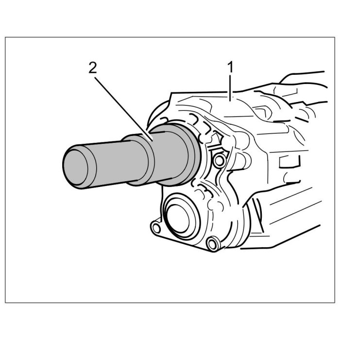 1.2. Fit assembly cover on the transmission housing -1- and use pressure piece T10180, -2- to drive it in evenly until the collar of the assembly cover is flush with the housing.