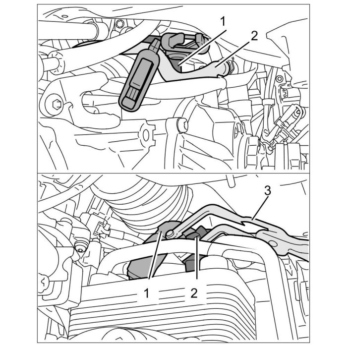 8.2. Disconnect coolant hoses -1- by releasing the spring band clamps -2- using a pair of angled spring band pliers -3- and pull off coolant hoses -1-.