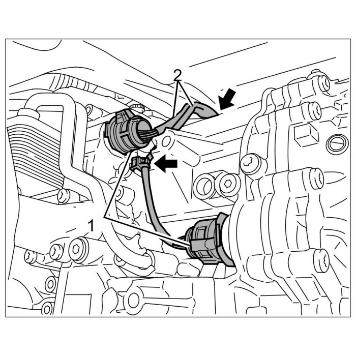 7.2. Detach clip holders -arrows- with electric lines -2- on the transmission and lay electric lines -2- aside.