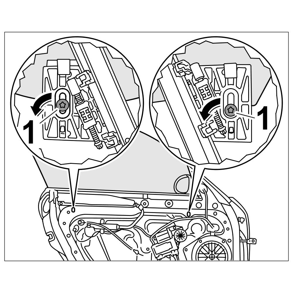 3. Loosen fastening screws -1- used to secure the door window glass -arrows-.