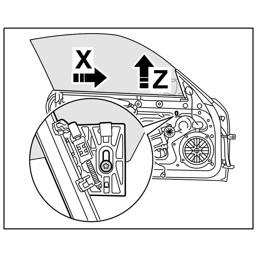 7.3. Slide the door window glass in position -Z- upward in the slot at the rear mounting piece (B-pillar) until the glass edge is flush with roof frame 2. Adjust at the adjusting screws on the drivers if necessary.