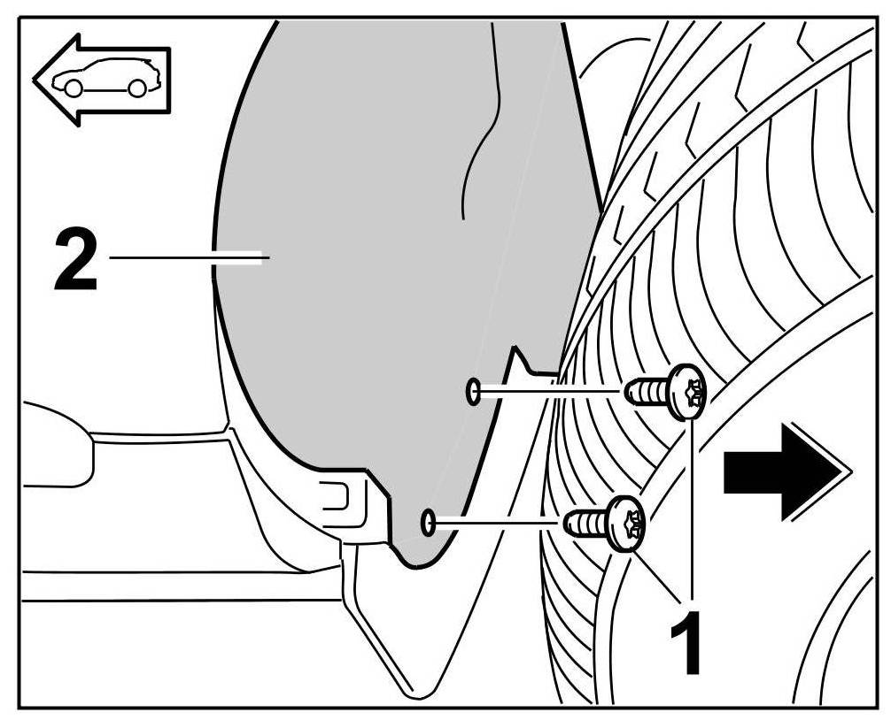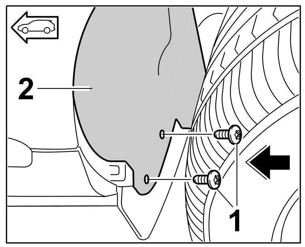 1.1. Unscrew fastening screws -1- on rear wheel housing liner -2- in the lower area -arrow-.