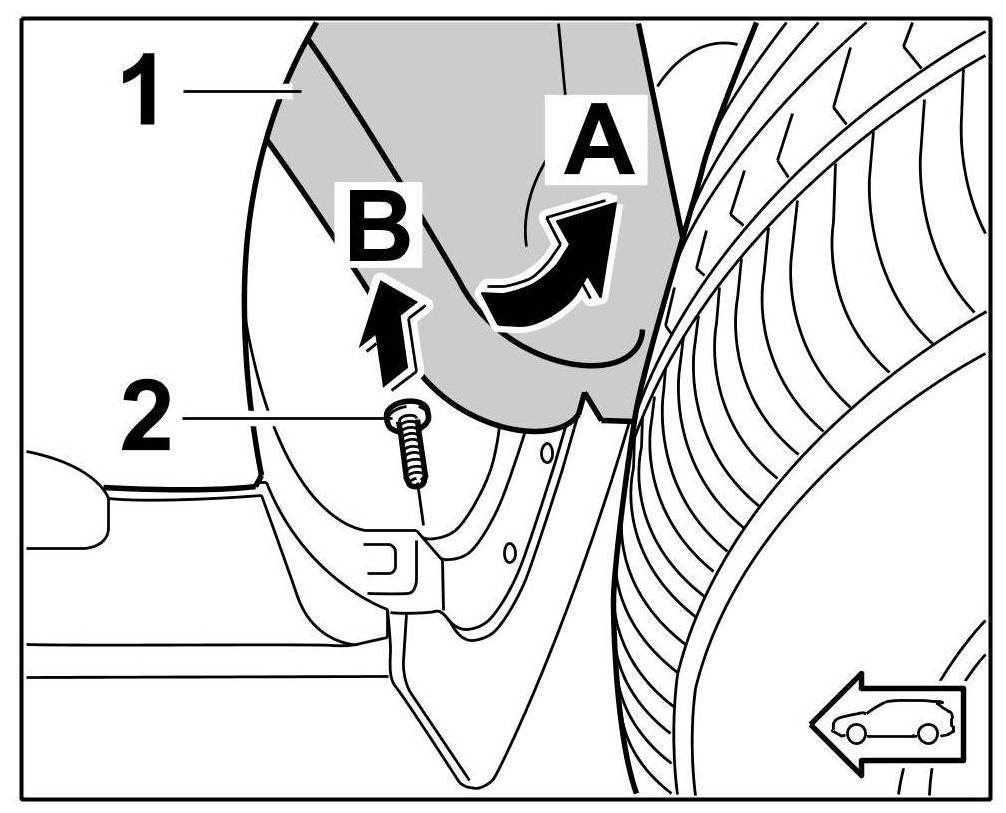1.2. Lift off rear wheel housing liner -1- in the lower area -arrow A- and unscrew fastening screw -2- ( -arrow B- ).