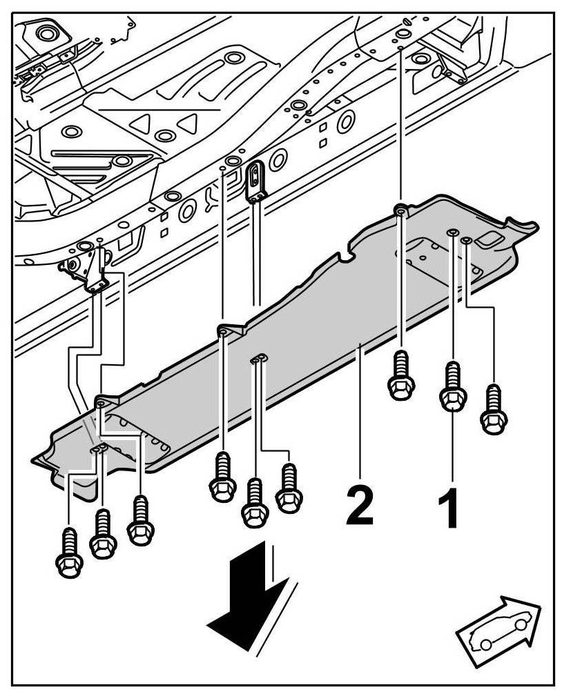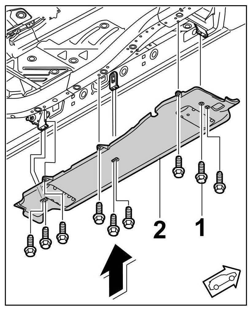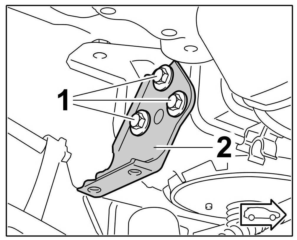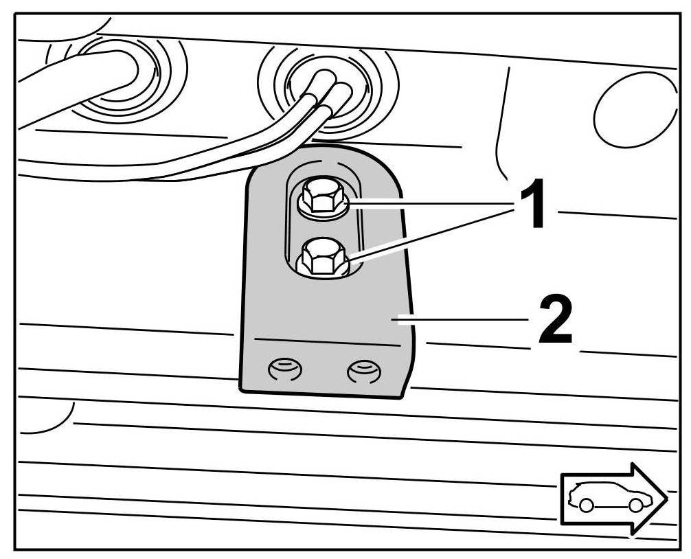 1.4. Position rear bracket -2- on the body and secure with the fastening screws -1-. => Tightening torque: 26 Nm (19 ftlb.)+/-2.6 Nm (+/-2.0 ftlb.)