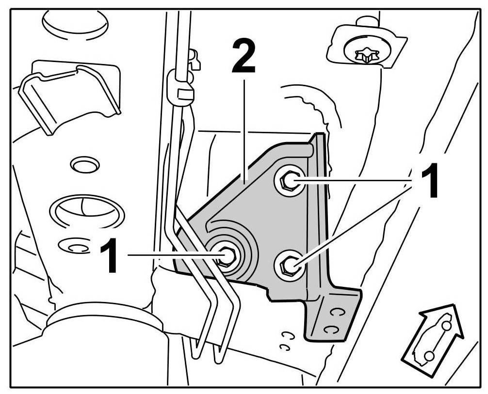 1.2. Position front bracket -2- on the body and secure with the fastening screws -1-. => Tightening torque: 26 Nm (19 ftlb.)+/-2.6 Nm (+/-2.0 ftlb.)
