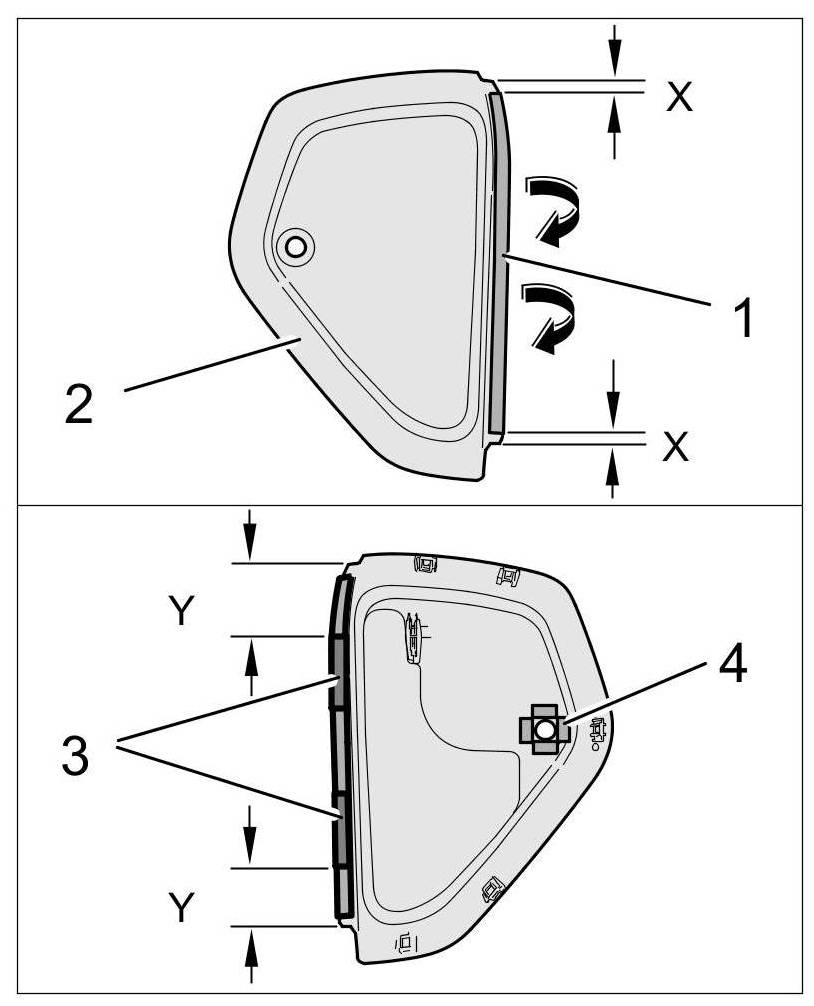 1.2. Stick raschel tape -1- at dimension -X= 10 mm- completely around the edge of the cover for the instrument panel -2- ( -arrows- ).