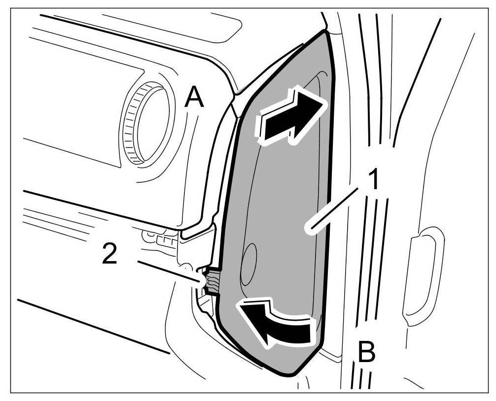 1.2. Swivel cover for instrument panel -1- inward -arrow B- and press it in until the retaining clips -2- click into place.