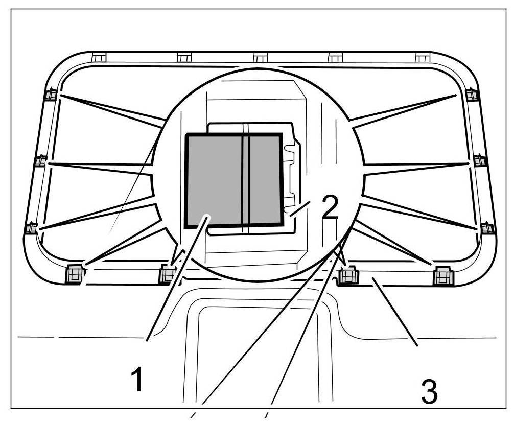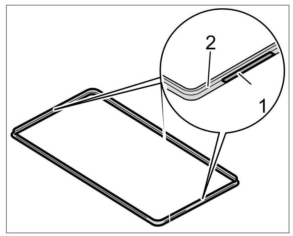 6. Stick felt strips -1- on the centre of the outside of the lower edge of the covering frame -2- at the left and right.