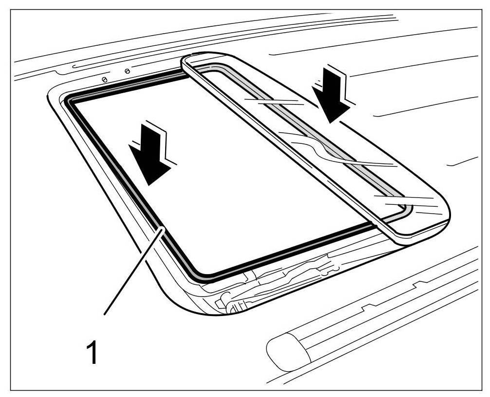 7. Position covering frame -1- at the sliding roof cut-out and clip it in at the fastening clamps -arrows-.