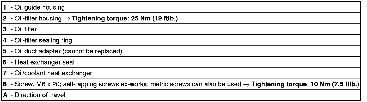1.1. Then move the oil/coolant heat exchanger into installation position and fit the fastening screws (turn screws by hand initially). The old self-tapping screws can be re-used. Tighten screws evenly and diagonally.