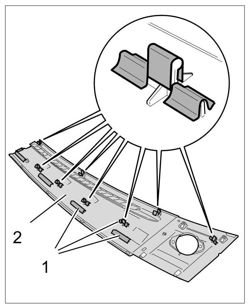 1.2. Stick raschel tape -1- over the bars and locking lugs of the cover for the instrument panel (defroster trim) -2- at the left and right.