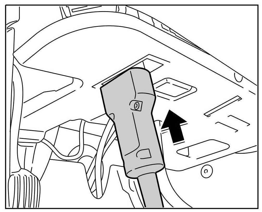 The Porsche System Tester is connected to the vehicle via a 16-pin diagnosis socket. The diagnostic socket is located inside the vehicle below the dashboard near to the driver (left-hand drive vehicles) or the passenger (right-hand drive vehicles) -arrow-.