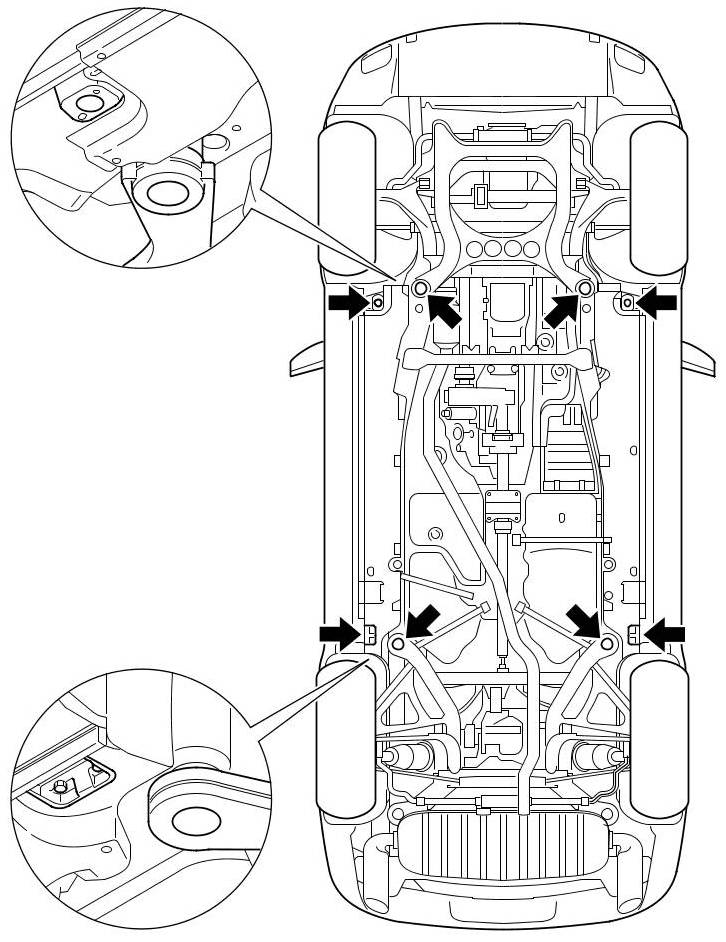 -> Before working on the vehicle, ensure that the ORS is engaged. The indicator light on the centre console button must be OFF. If the indicator light is on, follow the following procedure: Switch on the ignition and engage the road driving programme ]] High Range [[. The stabilizers must audibly engage. Now lift the vehicle.
