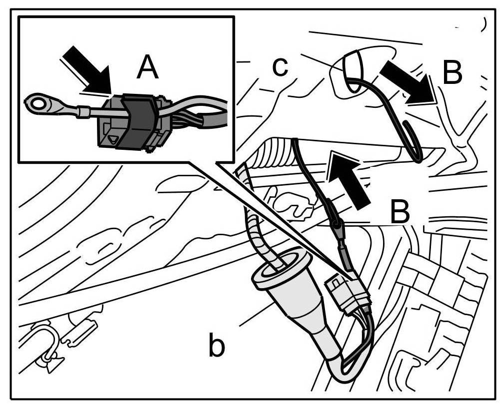 4. Draw tie-wire with wiring harness out through opening -Arrow B- until rubber sleeve -b- engages fully in opening in pneumatic spring housing -c-.