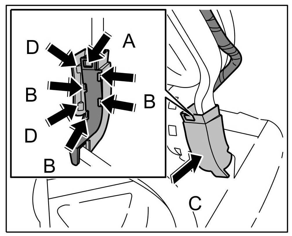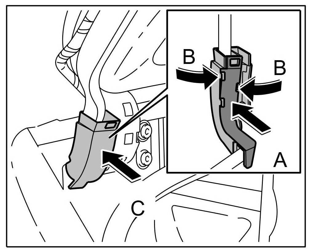 19. Push wiring duct onto hinge -arrow C- until locking tabs are felt to engage.