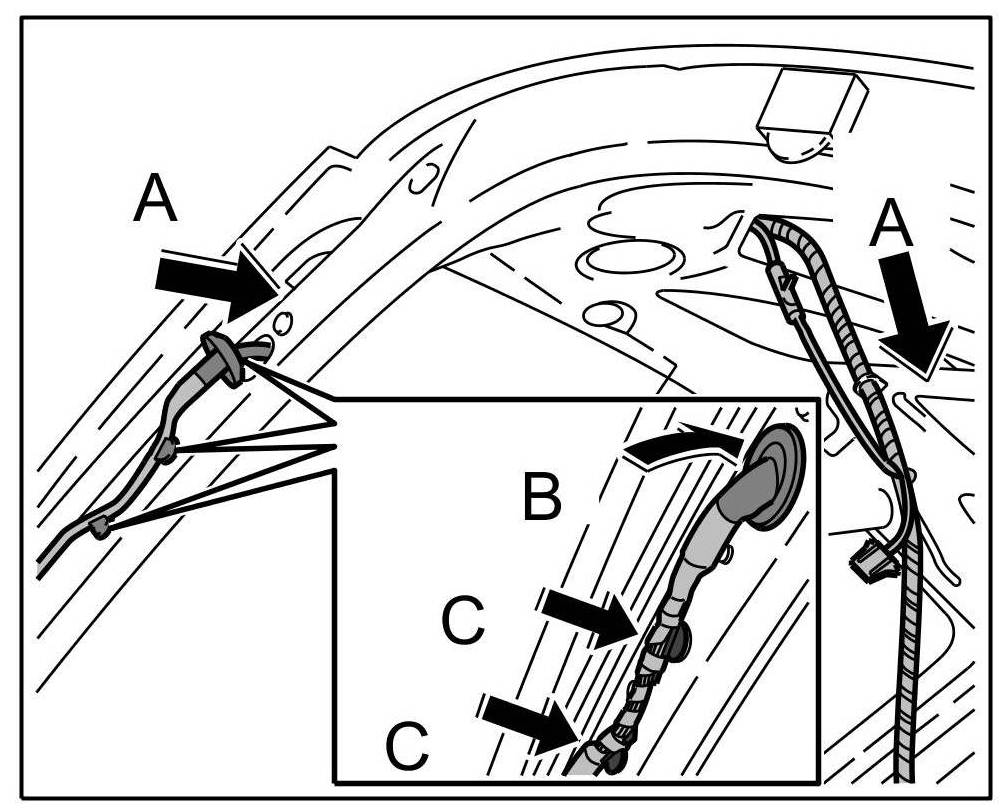 2. Pull wire harness through the opening -arrows B- until the rubber sleeve -arrow C- is felt to engage in the pneumatic spring housing.