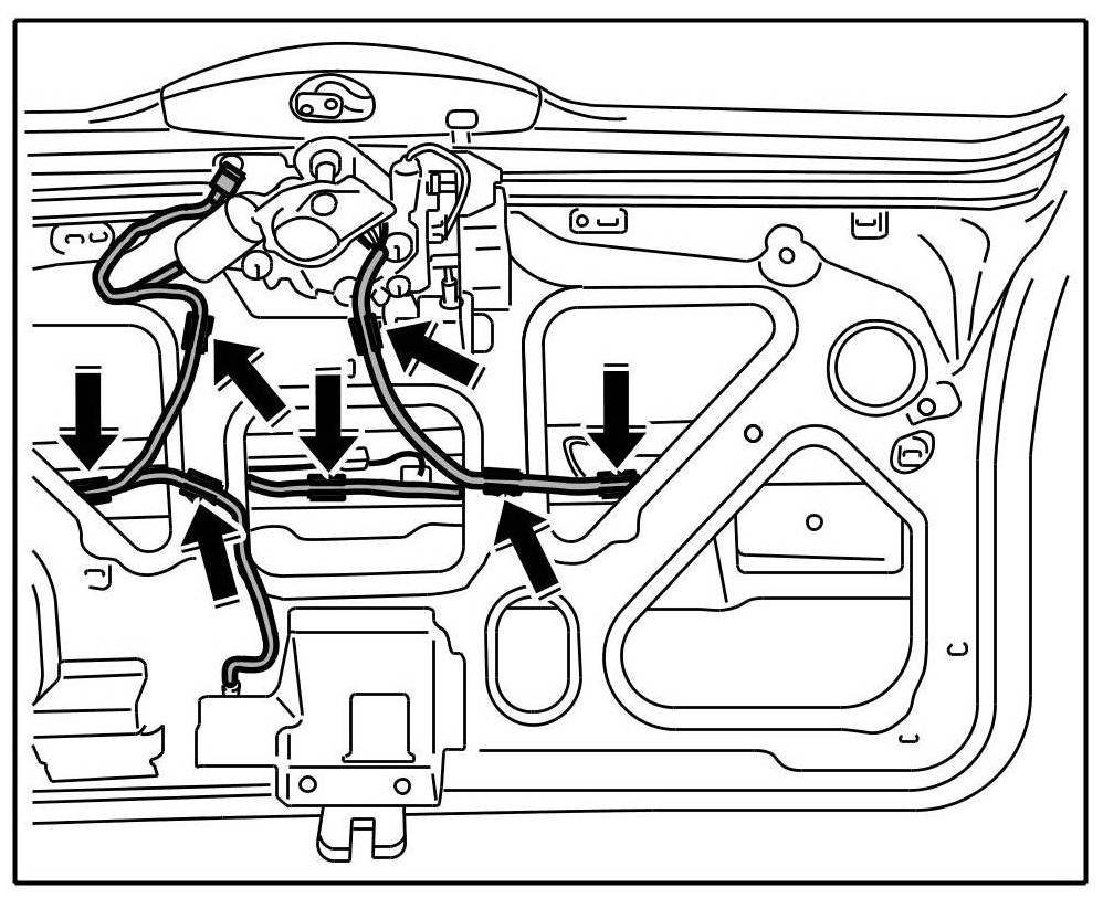 5. Clip wiring harness to window frame -Arrows C-.