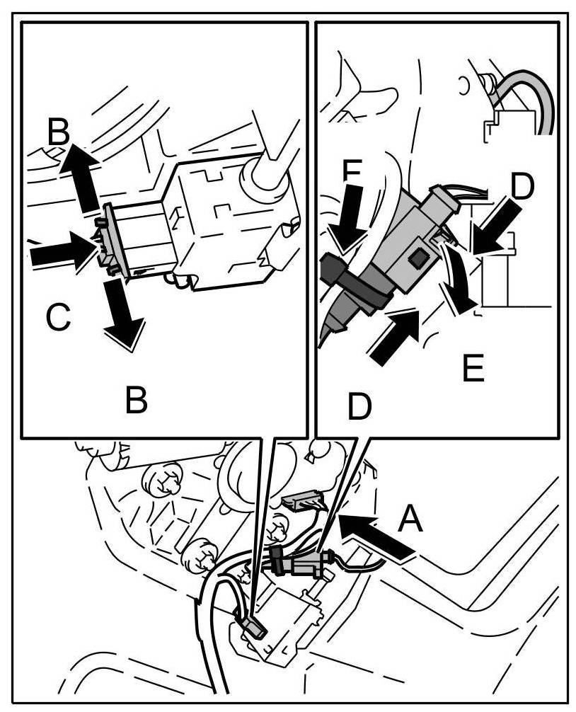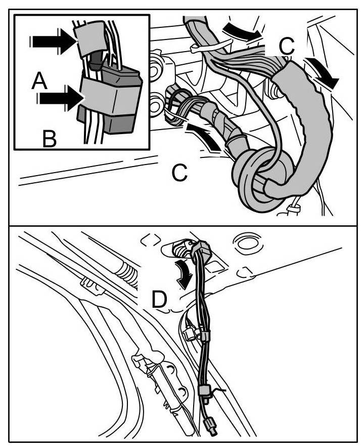 9. Insert connector onto contact switch -Arrow C- until the locking tabs -Arrows D- are felt to engage.