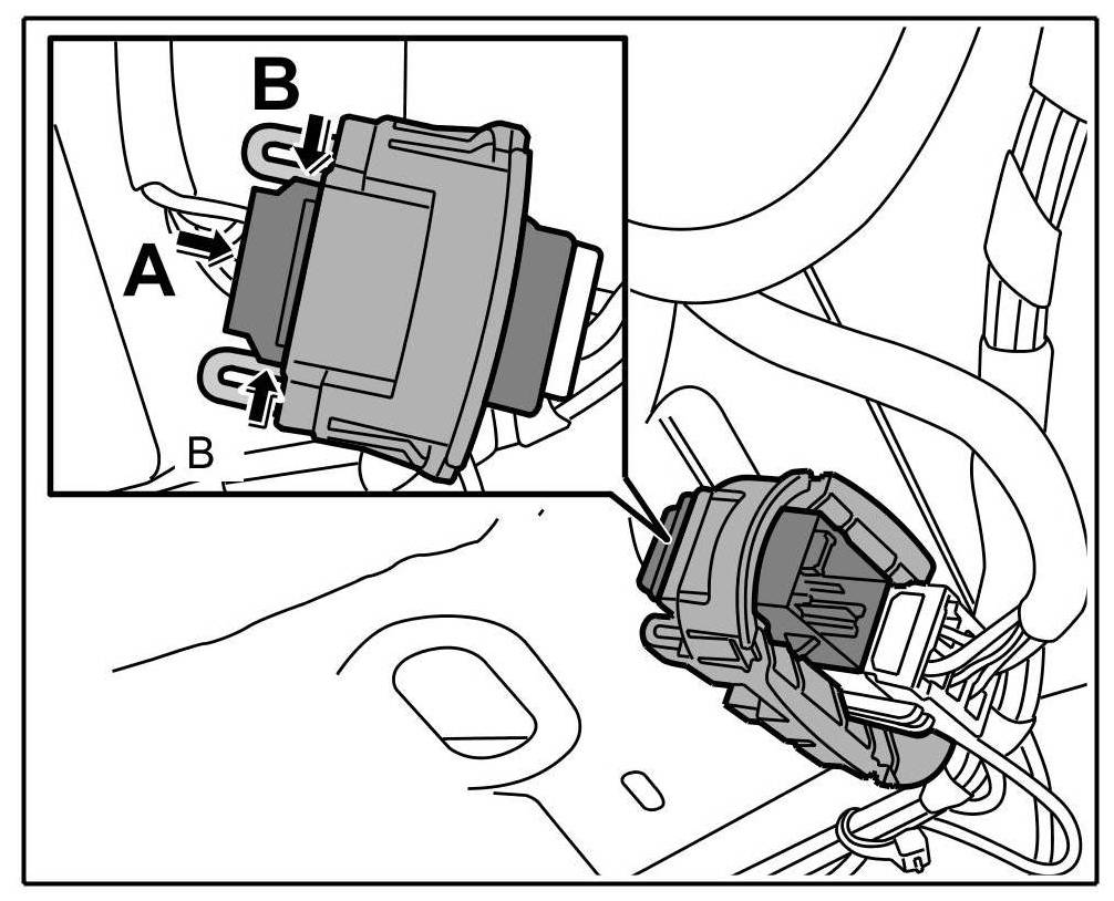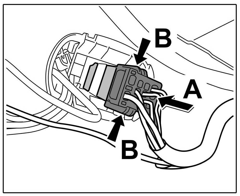 10. Insert connector -arrow A- until locking tabs -arrows B- are felt to engage.