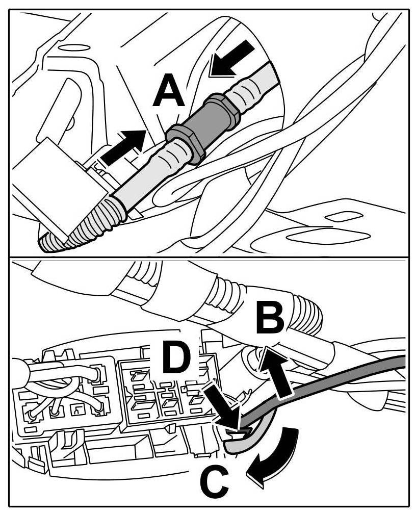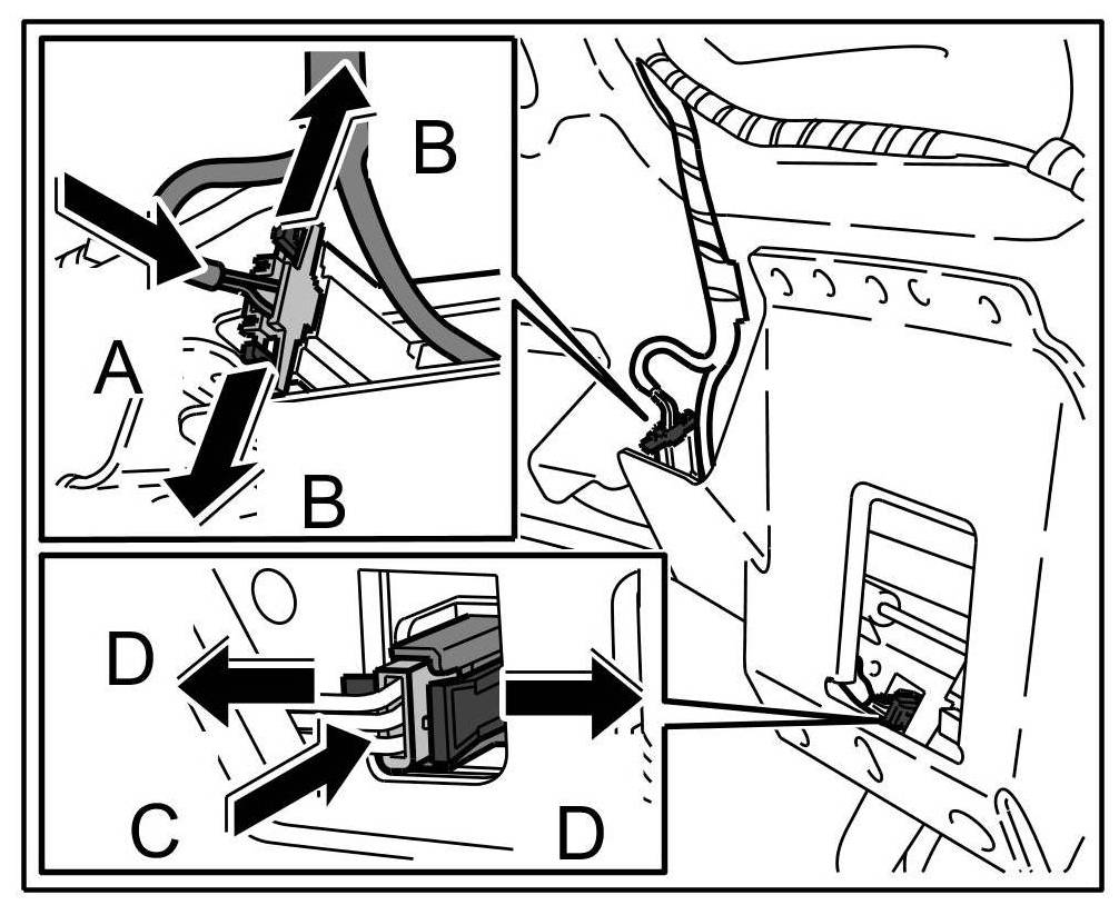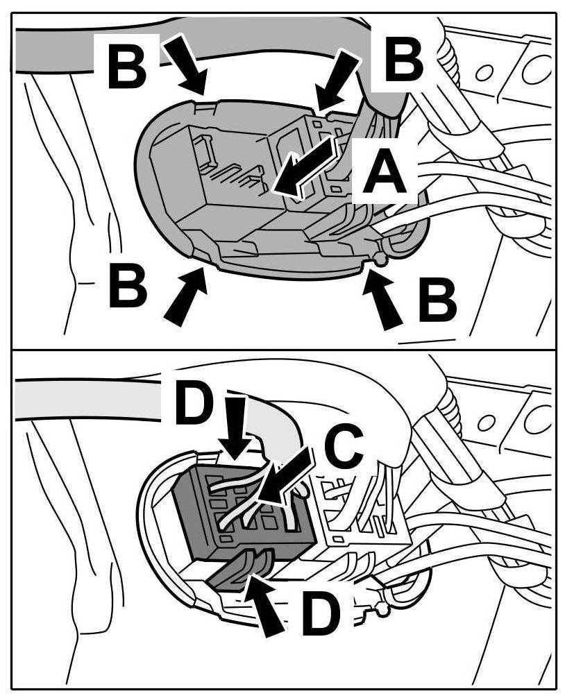 5. Insert blue connector -Arrow C- until the locking tabs -Arrows D- are felt to engage.