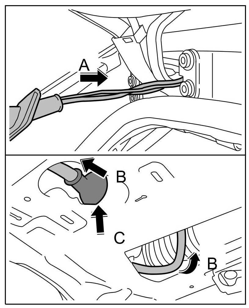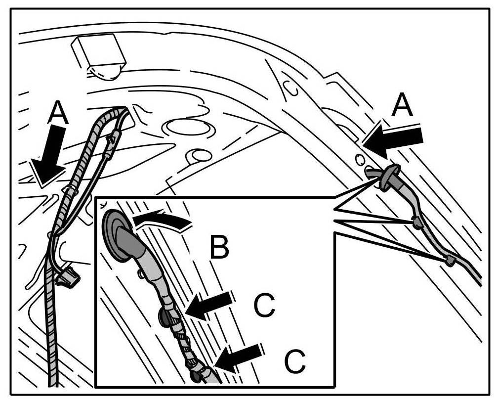 3. Push wire harness along hinge through pneumatic spring housing -arrows C-.