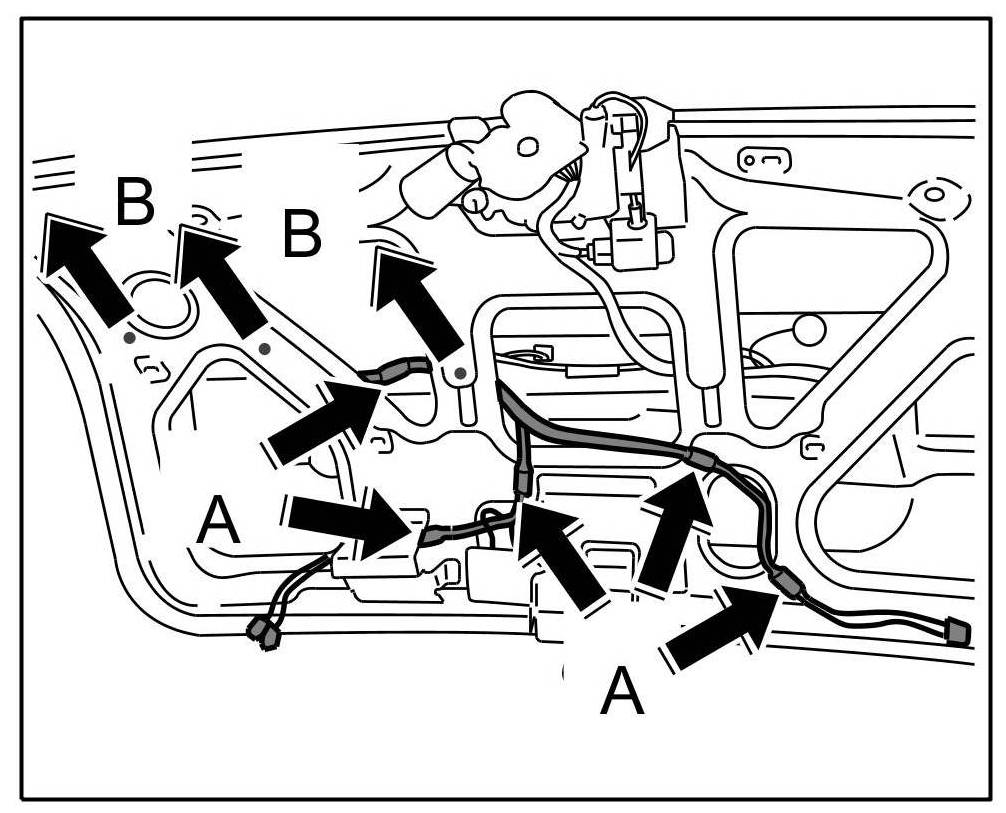 5. Clip wire harness to window frame -Arrows C-.